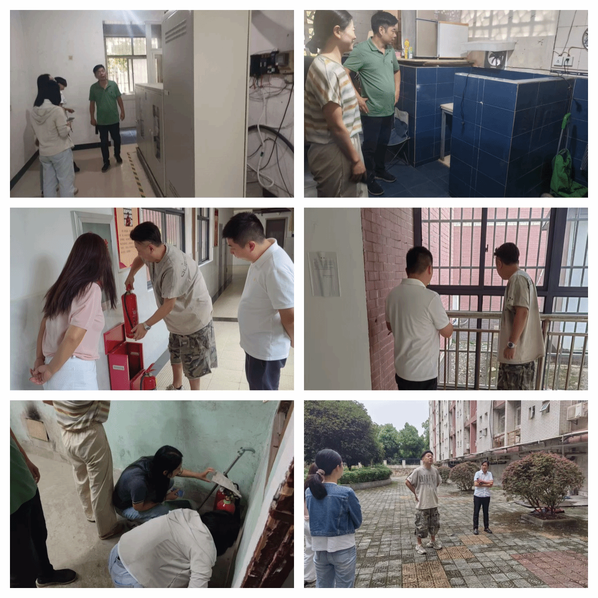 本次检查内容主要包括:楼内公共区域消防设施是否正常运行;强弱电井是否存在接线安全问题及漏水情况;公共区域栏杆是否松动;中庭及外围线路是否存在裸露现象;宿舍楼外墙是否存在掉砖风险等。