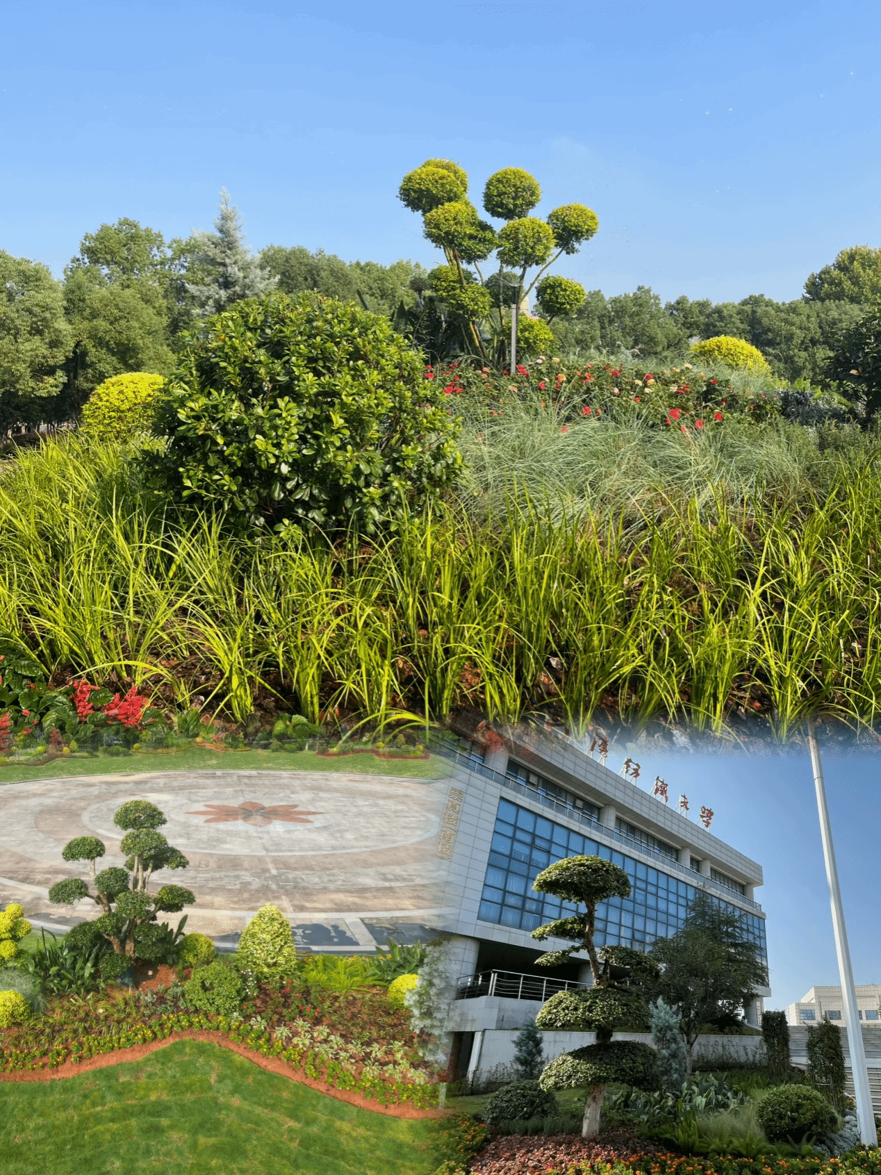 图书馆广场花境、东大门林下花带、主题景观节点等,打破了传统的绿化模式,借鉴自然生态理念进行艺术营造。层次丰富的乔灌木与缤纷的宿根花卉相映成趣,季相变化分明,色彩和谐灵动。既展现了植物的自然之美,也体现了设计者的巧思妙想,让校园的每一个角落都成为可驻足、可品味的风景。