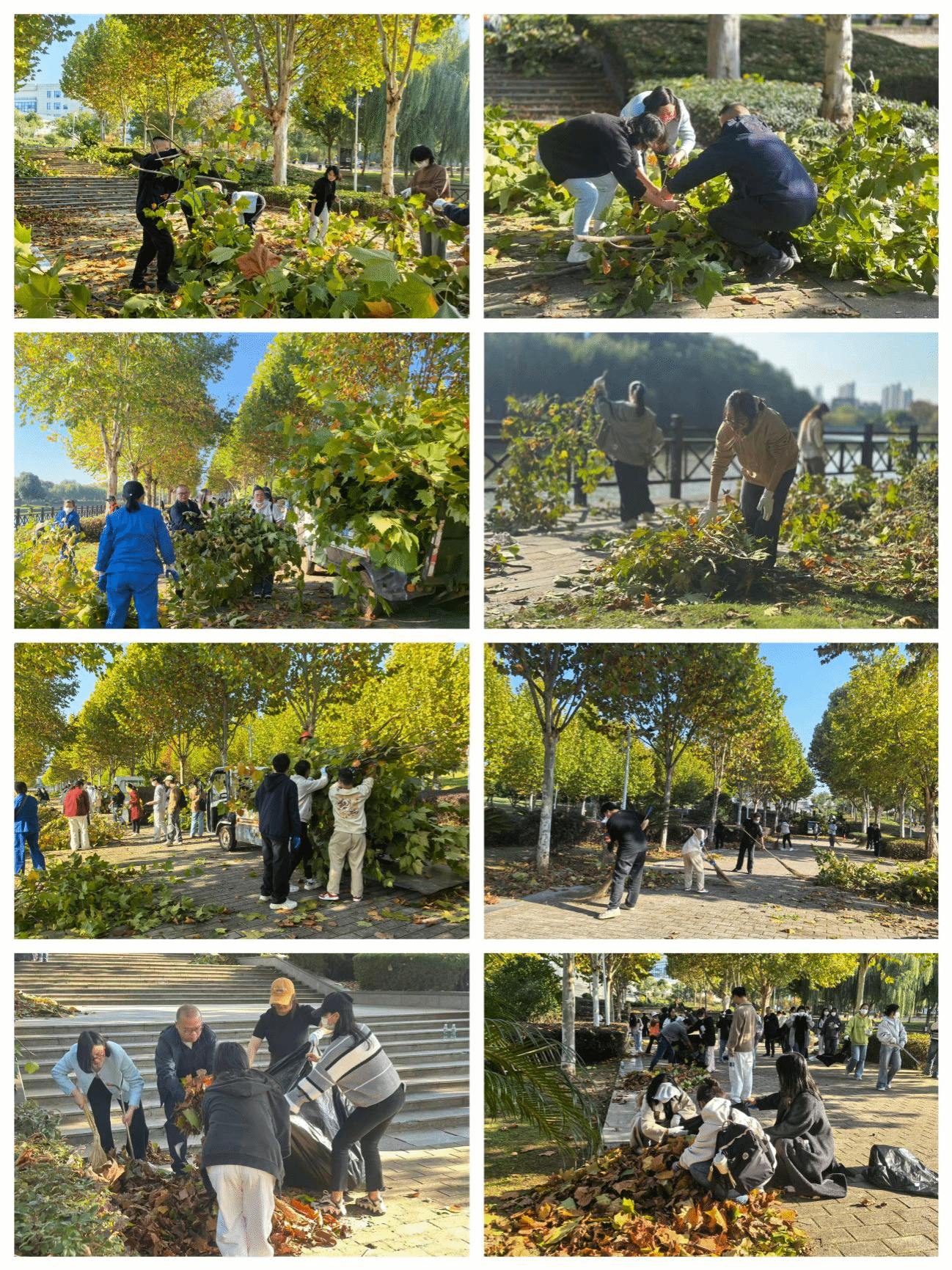 此前,生态绿化管理中心已提前完成景观大道法国梧桐的“美容理发”工作,通过抬高法桐分支点,对枯枝、下垂枝、徒长枝、内膛枝进行统一修剪,为树木营造向上生长空间的同时,也为此次落叶清理工作奠定了基础。活动现场,外语学院学生代表与阳光物业保洁团队、生态绿化工共同协作,用劳动为校园环境“梳妆打扮”,上演了一幕青春与责任共舞的动人场景。