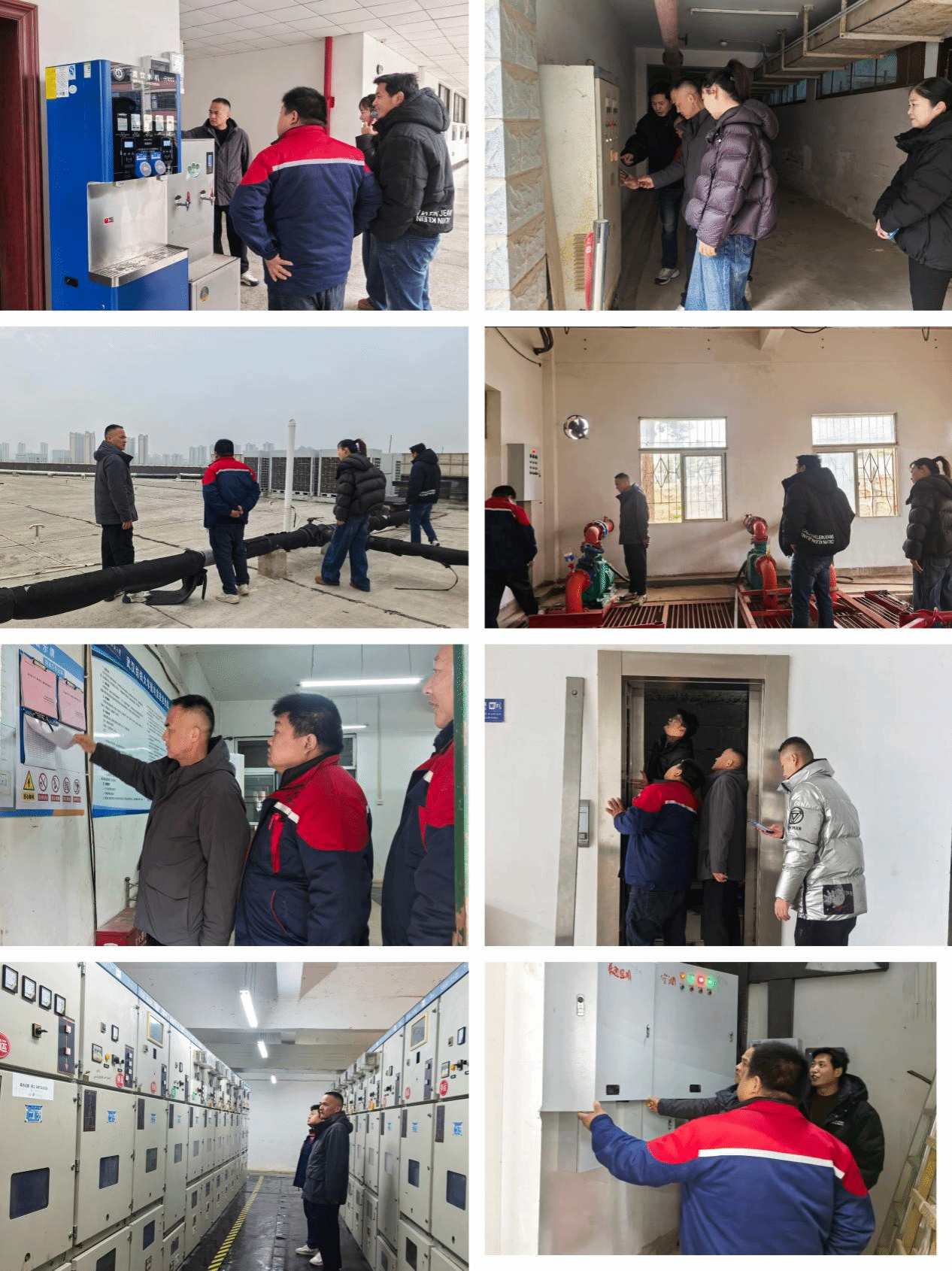 此次检查重点聚焦教学区域楼栋关键部位与核心设施,涵盖配电间、电梯、开水器、楼顶管道保温措施、楼梯间消防通道等多个重点区域,同时对配电房设备运行状态、各类安全记录台账完整性,以及污水泵房运行情况进行了细致核查。检查过程中,检查人员秉持“全覆盖、零容忍、重实效”的原则,对每个区域、设备逐一排查,仔细查看设备设施完好状况,确保不留死角、不漏隐患。