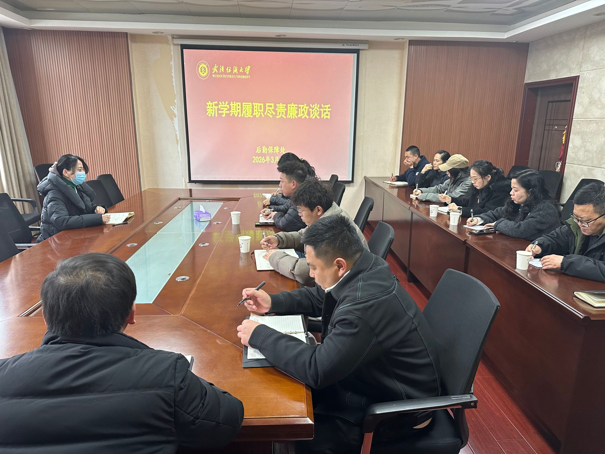 3月1日下午,后勤保障处党委书记卫冬妹与分管部门负责人及部门员工进行了全覆盖式履职尽责和廉政谈话。此次谈话旨在敲响廉政警钟,拧紧责任螺丝,为新学期后勤服务保障工作筑牢思想根基。