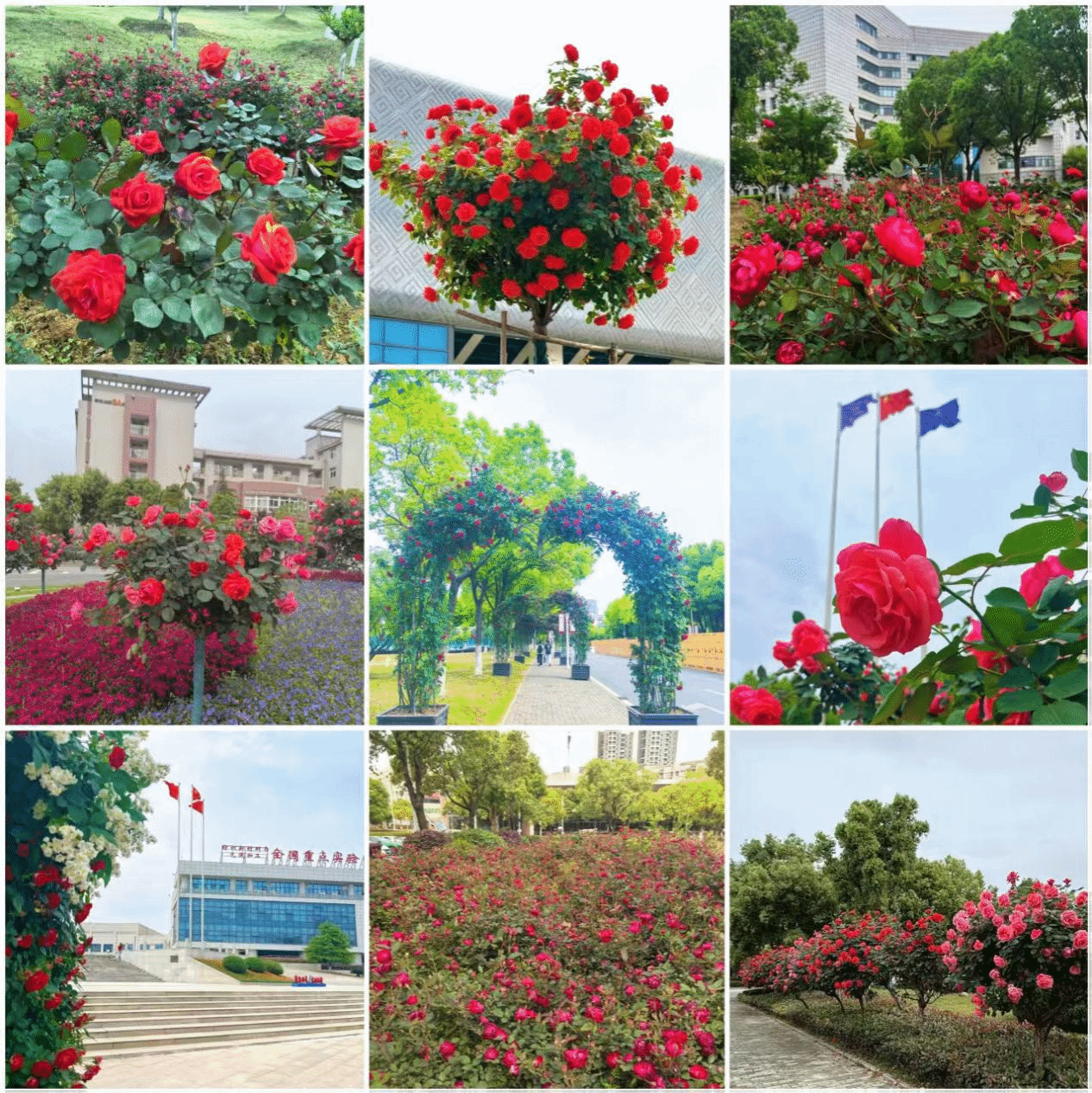漫步校园,从东大门入口、实训楼台阶、小西锦湖旁、北大门转盘至室内体育馆门口,处处可见月季的身影。丰花月季肆意绽放,团团簇簇如云霞漫卷;树状月季亭亭玉立,身姿挺拔自成风景;更有爱心造型的月季以浪漫姿态迎接往来师生。红的似火、粉的如霞、各色月季在春风中摇曳,花瓣层层舒展,有的饱满圆润,有的半开含羞,与嫩绿的枝叶相映成趣,勾勒出灵动鲜活的校园景致。